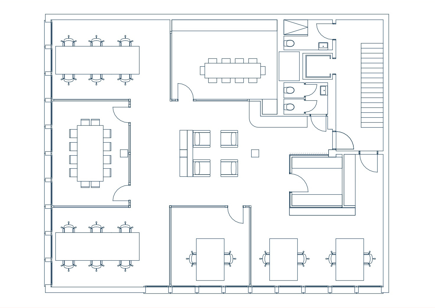 L’aménagement privilégie un open space fluide, ponctué de zones distinctes (bureaux fermés, salle de réunion, cuisine) pour optimiser la convivialité et la productivité.