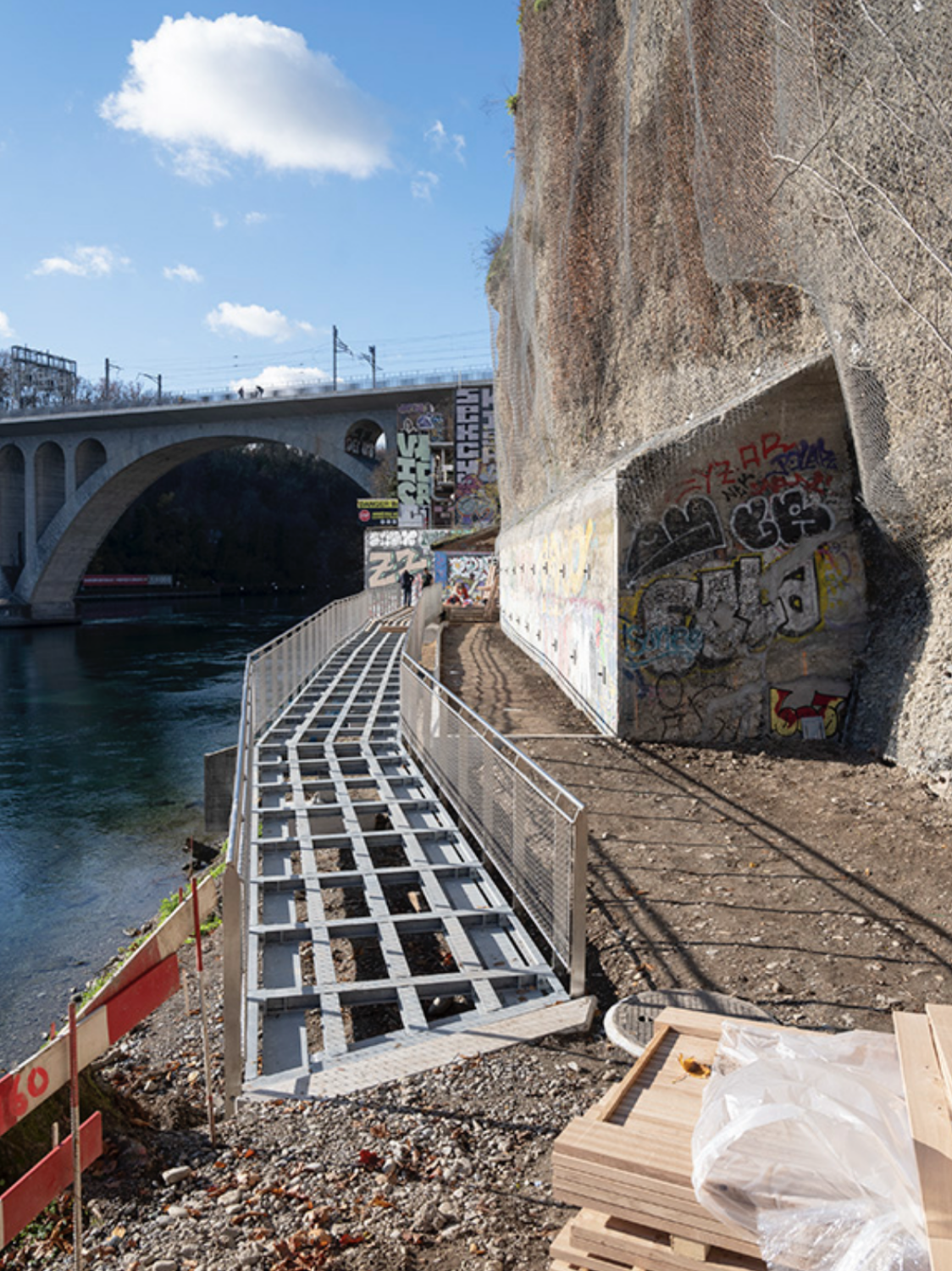 Face aux risques de chutes de pierres et à la détérioration de la galerie piétonne menaçant la promenade du bord du Rhône, la Ville de Genève a décidé de mettre en place un nouveau dispositif de sécurisation.