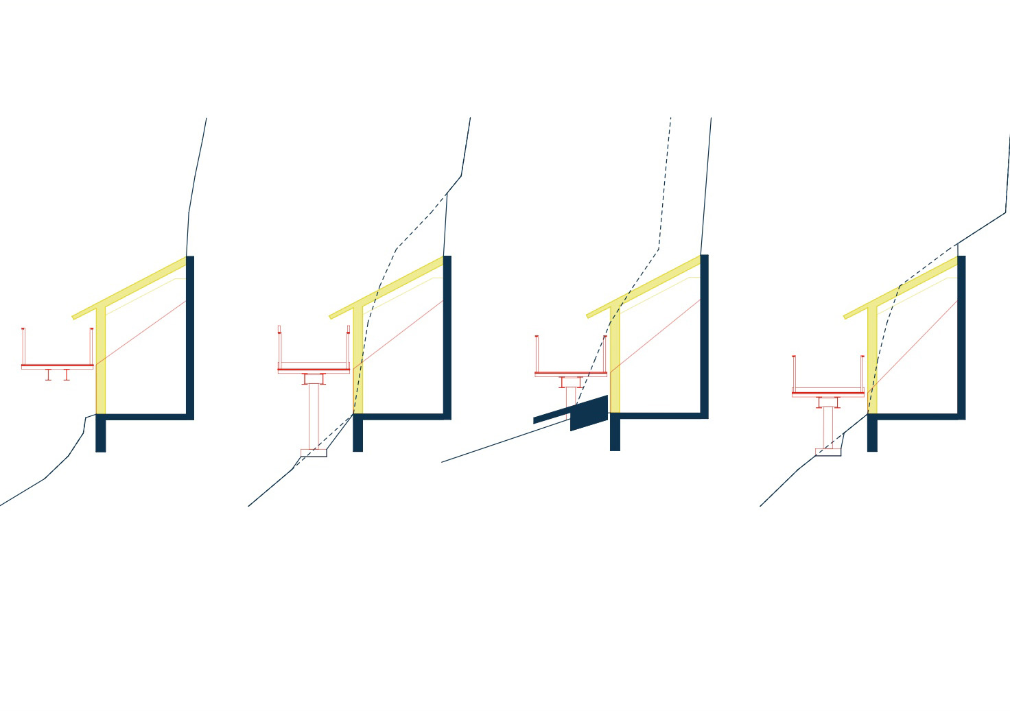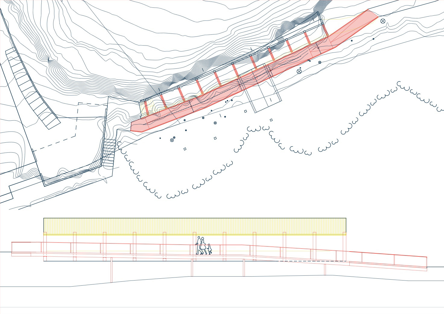 En complément des filets de protection installés le long de la falaise, le studio a proposé une solution pour remplacer l’ancienne galerie couverte par une passerelle à ciel ouvert.