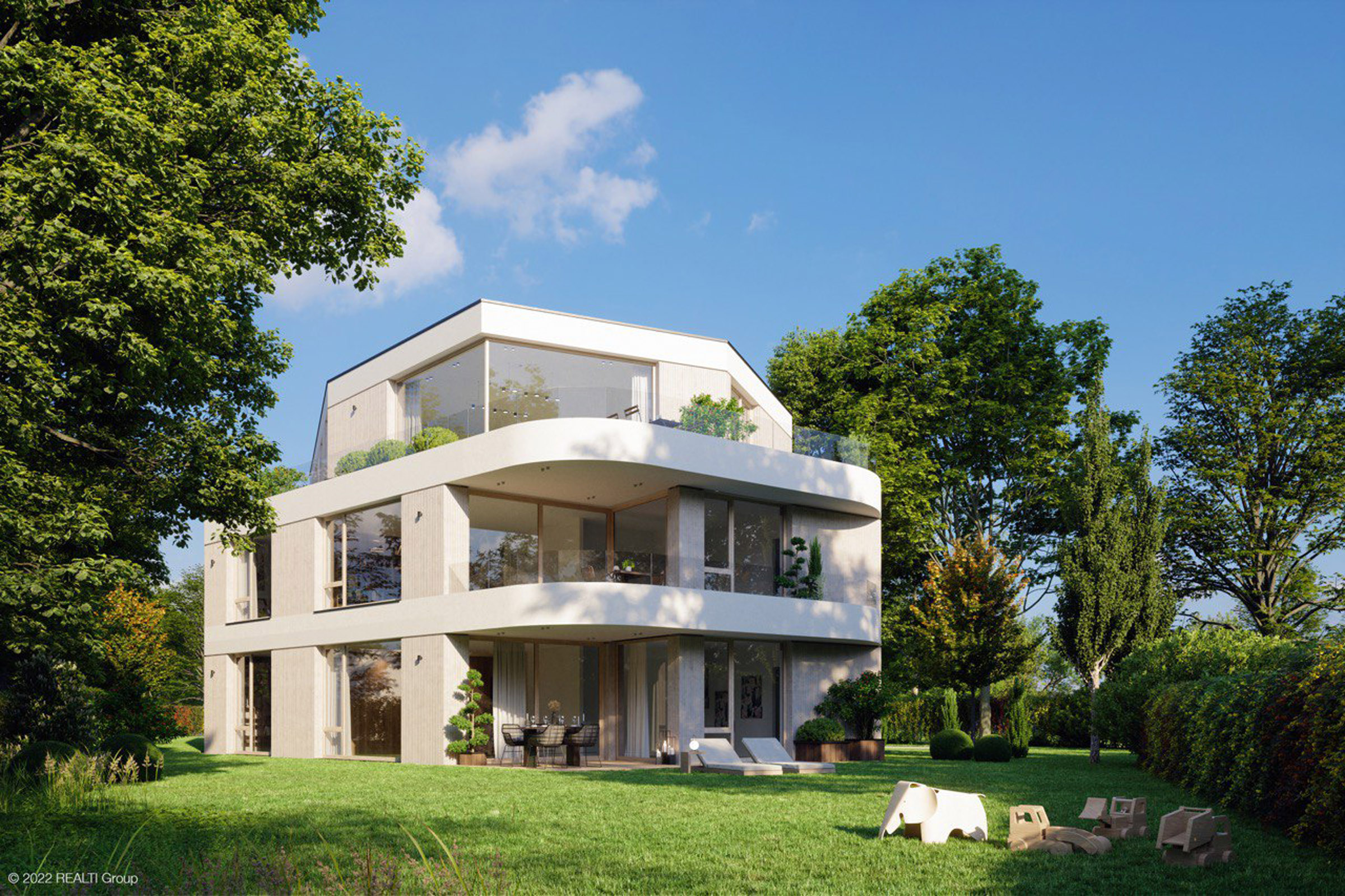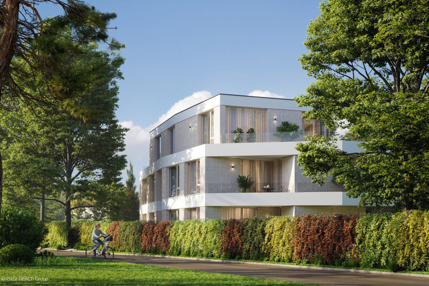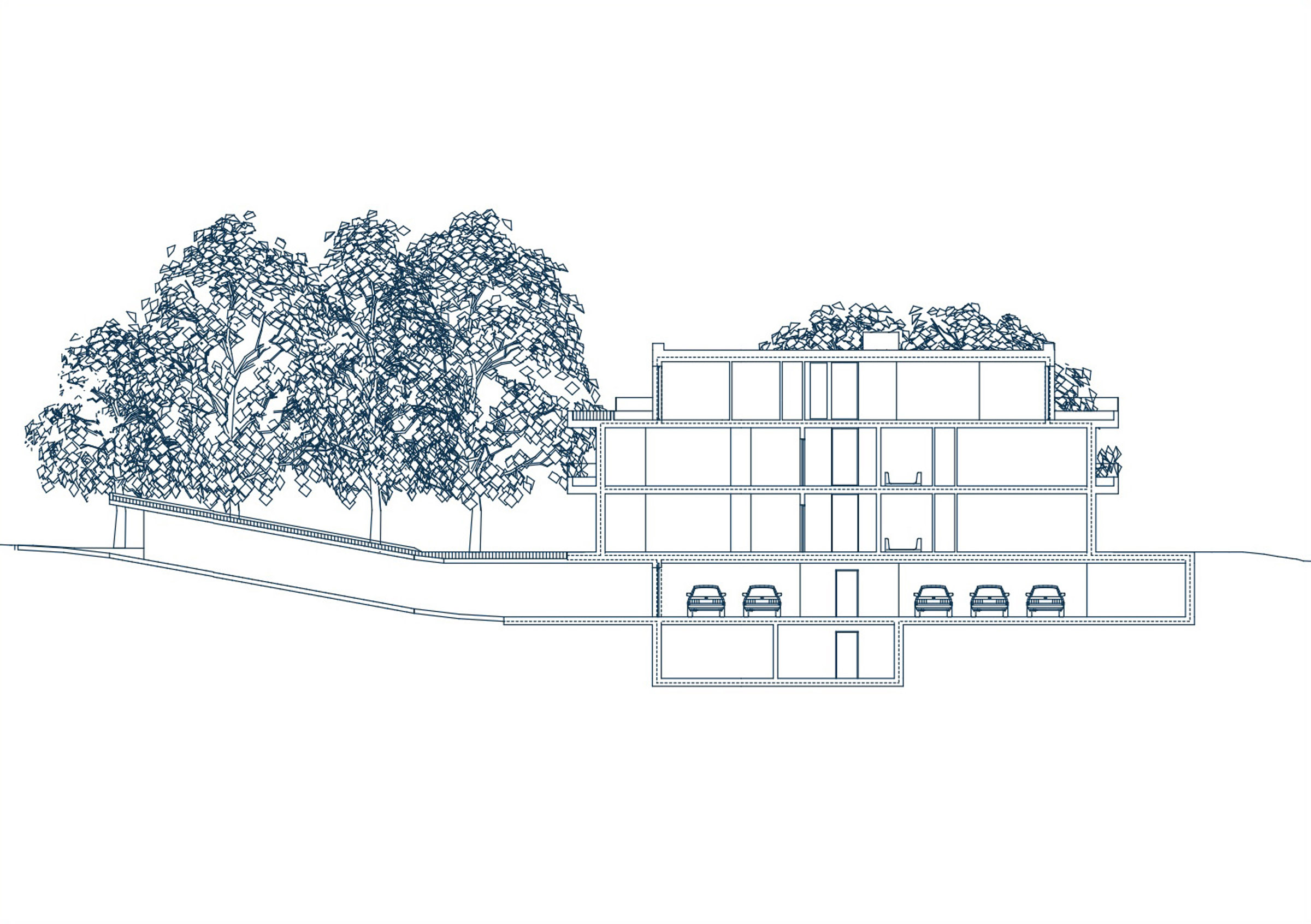 Malgré la densification progressive du quartier par des projets voisins, cet immeuble de cinq logements avec sous-sol s’intègre harmonieusement à son environnement densément arboré.