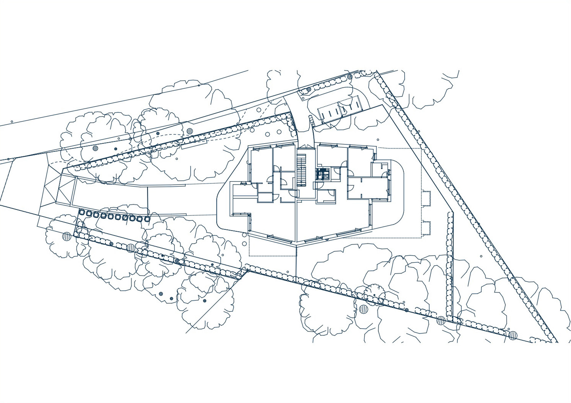Sa géométrie unique est dictée par la forme de la parcelle et la position des couronnes des arbres, préservant ainsi la richesse végétale existante. La matérialité sobre et minimaliste met en valeur la végétation environnante, créant un dialogue subtil entre architecture et nature.